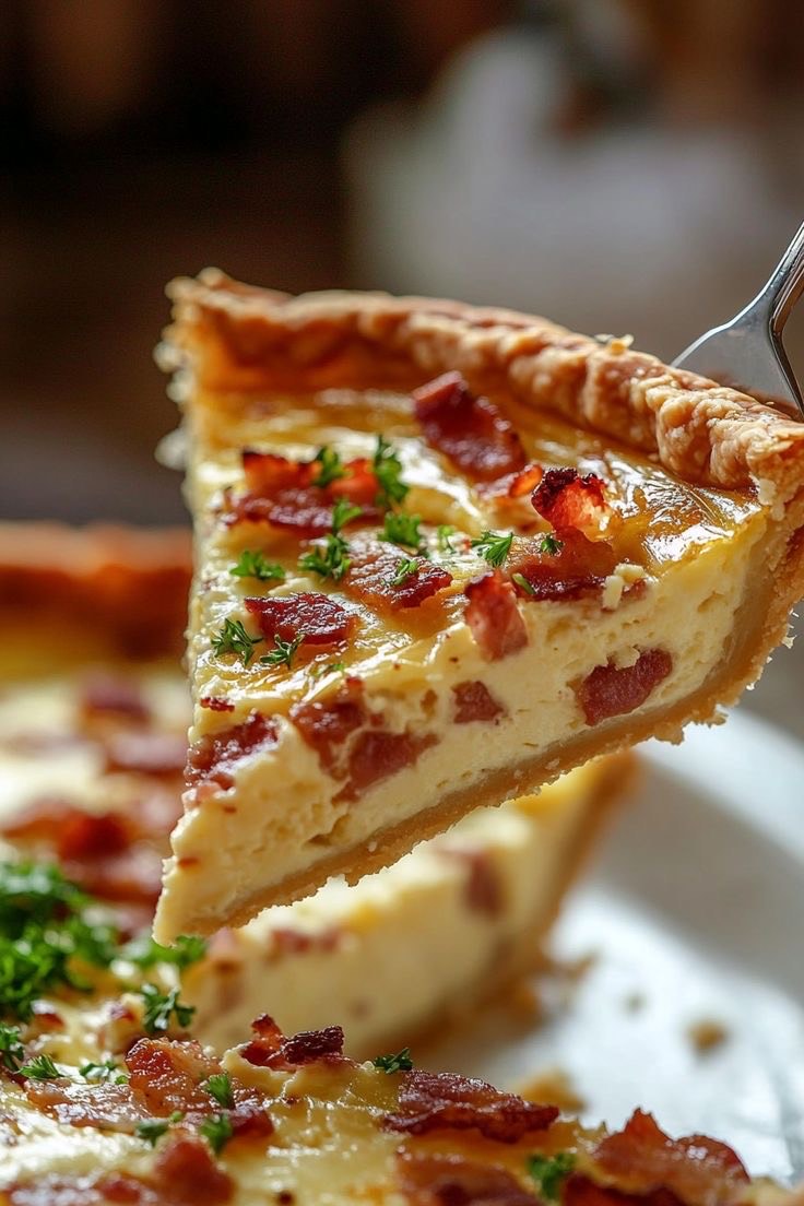 La traditionnelle quiche lorraine, à base de pâte dorée, lardons fumés, œufs et crème, cuite au four pour un fondant irrésistible.
